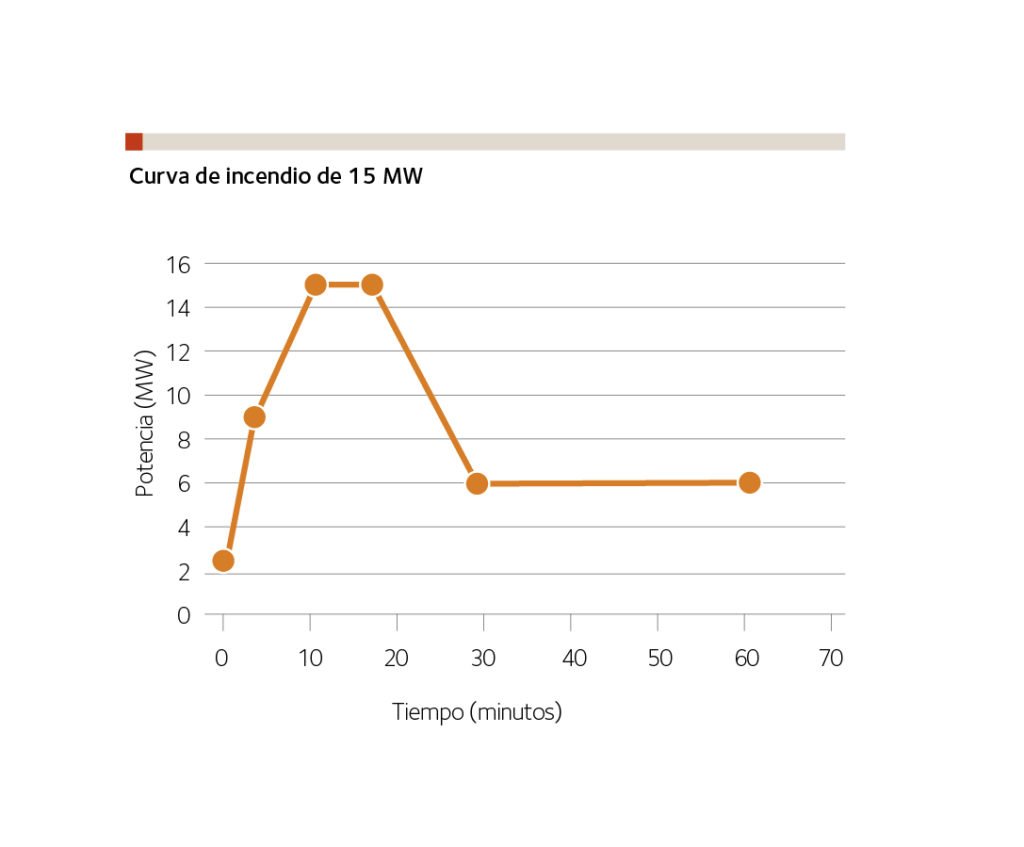 Para la realización de las simulaciones se ha supuesto la generación de un incendio de 15 MW de potencia, siguiendo la IFI-2018 (7), según la curva de incendio mostrada en el gráfico de arriba.