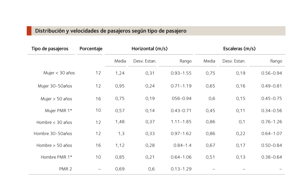 MSC/CIR 1533 “Interim Guidelines for Evacuation Analysis for New and Existing Passenger Ships”, (IMO) International Maritime Organization y concuerda con los datos proporcionados por J.Fruin. “Pedestrian planning and design, Metropolitan Association of Urban Designers and Environmental planners”, New York, 1971.
