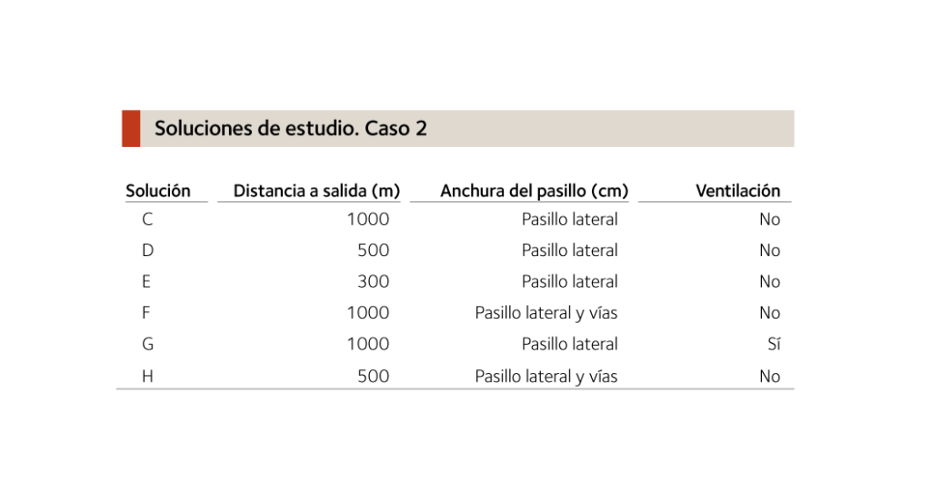 A fin obtener una mejor comprensión de la incidencia que diversos parámetros tiene en la eficacia de la evacuación, se ha realizado un segundo estudio en el cual se han llevado a cabo diversas simulaciones del túnel de estudio, suponiendo las soluciones recogidas en la tabla de la derecha.