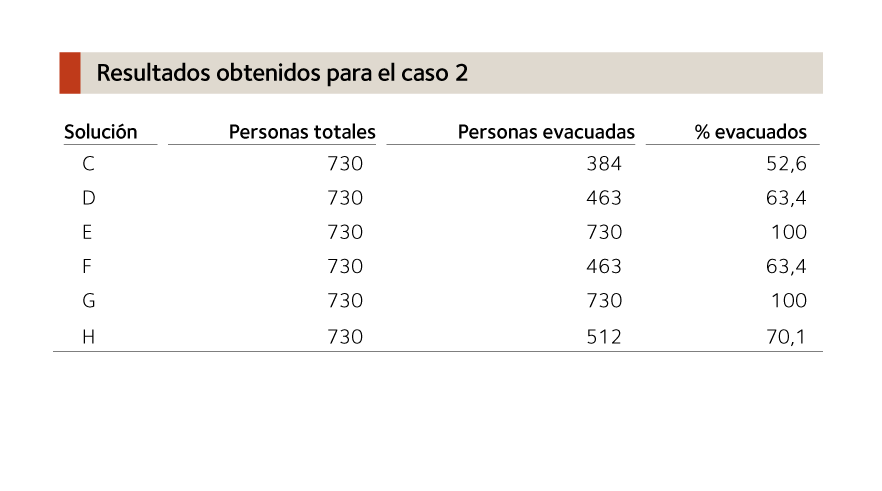 Para el caso 2, tras realizar las simulaciones de incendio y evacuación con la consideración de que aquellas personas con un FED superior a 0,3 quedan incapacitadas y no logran evacuar, se han obtenido los resultados, indicados en la tabla de la izquierda.