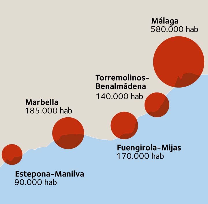 La conurbación conocida desde mediados del siglo pasado como Costa del Sol alberga en estos momentos bastante más de un millón y medio de habitantes, incluyendo Málaga ciudad.