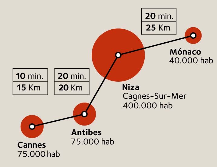 El caso de Niza y la Costa Azul, por su semejanza con la Costa del Sol, podría constituir un buen referente. En ella, la oferta ferroviaria de media distancia es, sin duda, uno de los factores esenciales para mantener, entre sus núcleos hegemónicos, vínculos cotidianos propios de una gran metrópoli. Cualquier ciudadano de Antibes, Cannes etc. se siente inmerso en áreas de mercado de escala muy superior a las de su lugar de residencia. Desplazarse en menos de una hora a distancias superiores a los 60 kilómetros sin necesidad de utilizar el vehículo privado es un privilegio poco valorado, pero no por ello menos importante para preservar una forma de vida que diferencia a estas ciudades-región conformadas por agregación de núcleos menores, con tamaños del orden del millón de residentes, distancias entre sus extremos de entre sesenta y cien kilómetros aproximadamente, y que mantienen como rasgo genuino de identidad su aspecto de «pequeñas grandes ciudades».