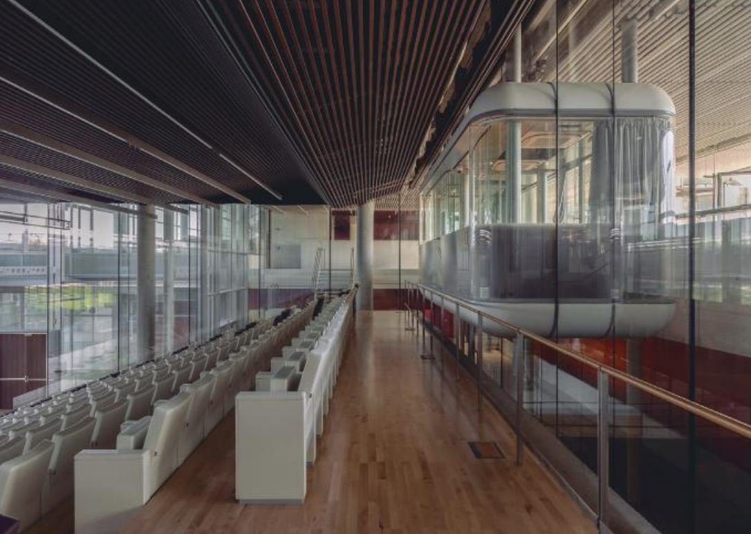 Cabina de interpretación del auditorio de la sede corporativa del Banco Popular (actualmente Banco de Santander España) con estructuras de techo y suelo realizadas con material compuesto de GFRP con núcleo de polietileno (PET) y construido por el método de infusión. Madrid.