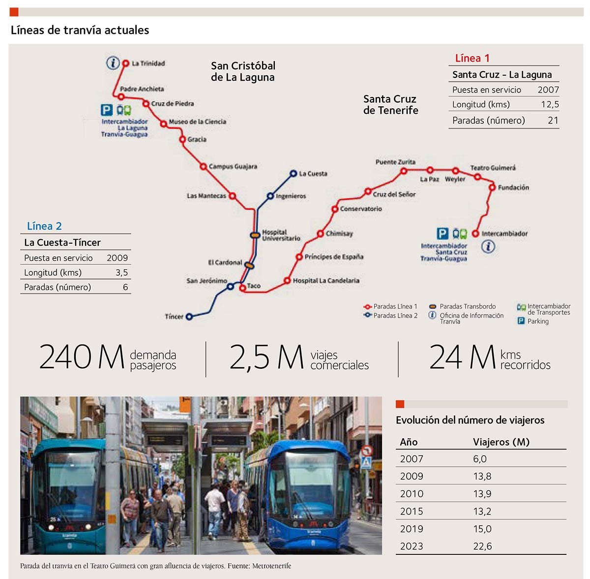 Actualmente, el tranvía es el eje vertebrador de los principales núcleos de actividad educativa, económica, sanitaria, administrativa y social de los núcleos urbanos de Santa Cruz y de La Laguna, la mayor conurbación de Tenerife. La red tranviaria da servicio al 66% de la población residente, lo que equivale a unos 226 000 habitantes. Su oferta regular, los 365 días del año, ha permitido contribuir a la calidad medioambiental de estos dos municipios al evitar unos 3 millones de desplazamientos en vehículo privado al año.