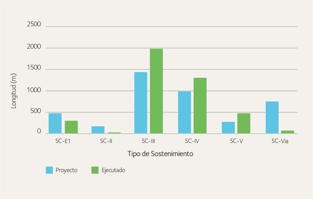 En el ámbito general de los tres túneles, la mejor calidad de terreno encontrada, sobre todo en los primeros metros de excavación desde todos los portales, favoreció la instalación de sostenimientos menos pesados, haciendo que el cómputo global de metros ejecutados de sostenimientos medios fuese mayor.