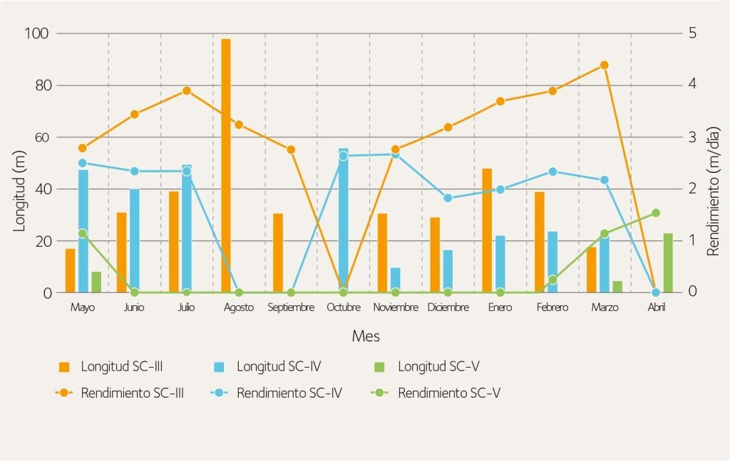 Por otro lado, los rendimientos en metros/día se mantuvieron relativamente constantes en función del tipo de sostenimiento instalado.