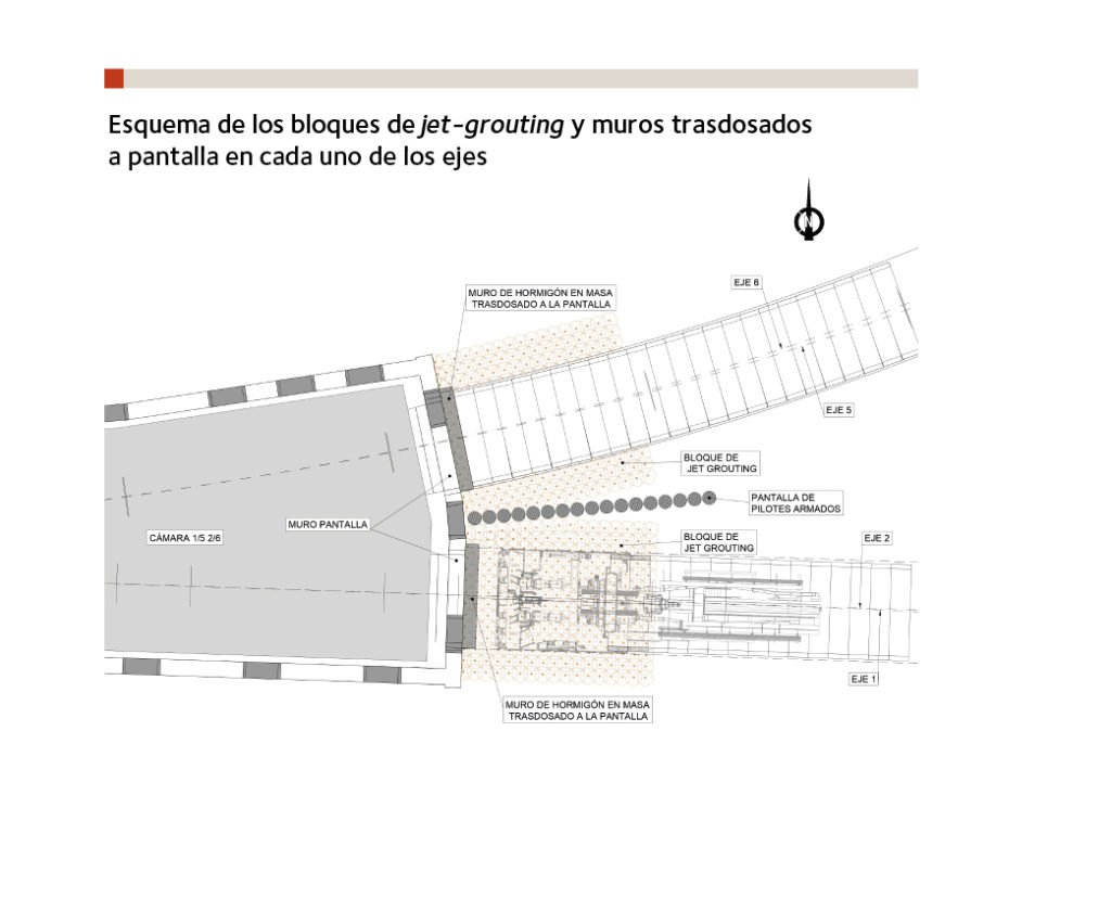 La cuestión es que la existencia de este muro imposibilitó la ejecución de las dos primeras filas de columnas de jet más próximas tras la pantalla; se recomendó sustituirlas, al menos, por otras inclinadas, para que esta zona de cale no quedara sin tratar, pero la operación no se llevó a cabo por limitaciones en los plazos de obra.
