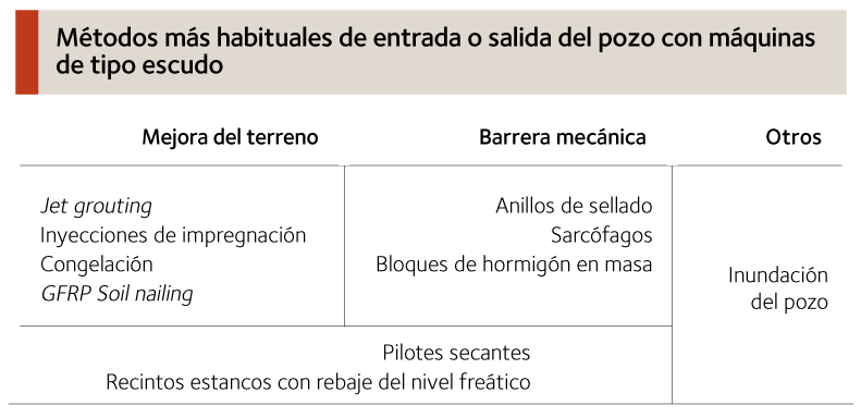 Los métodos de mejora del terreno de las zonas de llegada y salida de los pozos son variados. En general, todos ellos están destinados a la consecución de una masa de suelo sólida, compacta y consolidada. El más común probablemente sea el jet grouting. Una forma similar de conseguir un bloque adecuado es mediante la técnica de sustitución con columnas secantes (plásticas o de mortero). En otras ocasiones las técnicas se combinan, como en el proyecto de la L3 de Sofia (Bulgaria), donde se usaron conjuntamente inyecciones de impregnación con soil nailing a base de barras de fibra de vidrio.