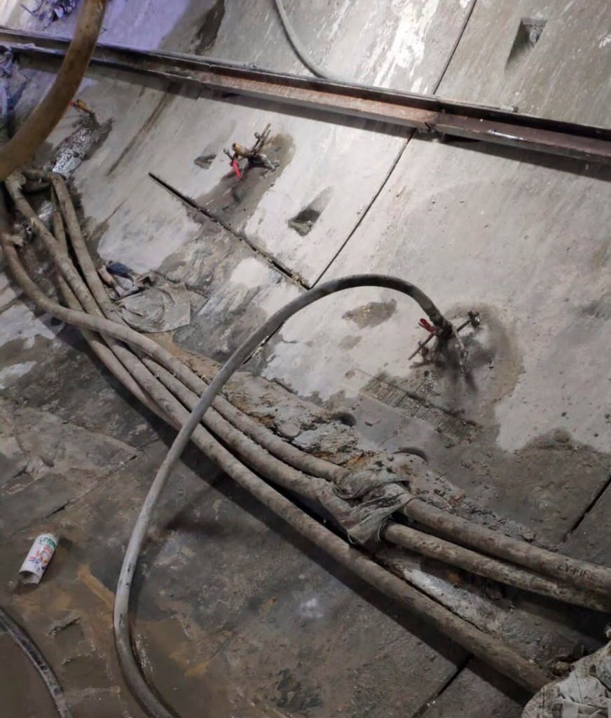 Por tanto, la situación en la cámara antes del incidente era la siguiente: túneles de los ejes 6 y 5 (superpuestos) acabados, bloque de jet grouting ejecutado, pero no estrictamente según diseño, y anillo de sellado simple instalado en la cara expuesta de la cámara de llegada.