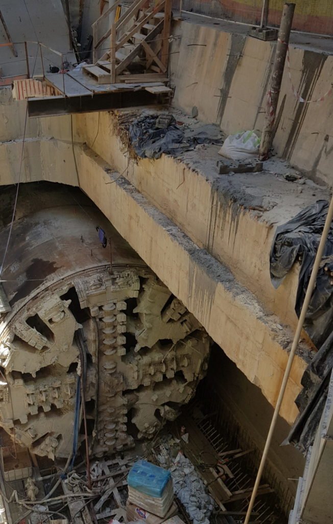 En la imagen de la derecha se puede observar que los dos túneles del lado izquierdo de la fotografía (tanto el del nivel superior como el del nivel inferior) ya se encuentran ejecutados. El incidente que describe este artículo se produjo durante la entrada de la tuneladora del nivel inferior derecho, donde ya estaba montada la cuna de recepción. Posteriormente al desmontaje de esta tuneladora y extracción a la superficie, se produciría la llegada de la tuneladora del nivel superior derecho.
