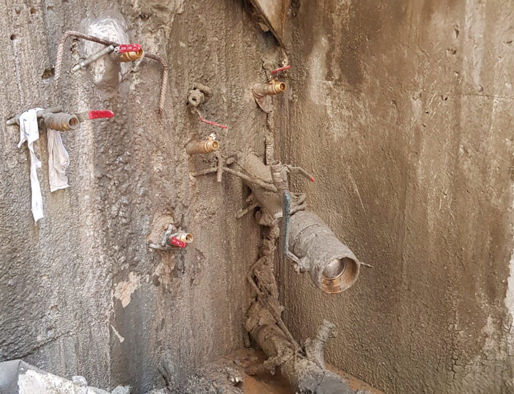 Cuando se trata de una entrada al pozo, también se puede recurrir a la inundación del interior del mismo hasta una altura por encima de la posición del nivel freático. El equilibrio hidrostático generado evita un gradiente hidráulico en el terreno, reduciendo el riesgo de rotura. Esta técnica es empleada donde otras no son posibles, por ejemplo, debido a ocupación superficial, afectación a servicios existentes, tráfico, etc., y generalmente en pozos de pequeño tamaño. Esta técnica también ha sido utilizada en el proyecto que nos ocupa; como vemos, el tamaño de esta línea de metro ha dado lugar a un abanico grande de soluciones técnicas y métodos constructivos.