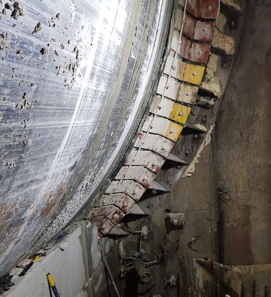 De las soluciones basadas en barreras mecánicas, el anillo de sellado probablemente sea la preferida hoy en día. Este dispositivo permite limitar la entrada de agua a través del espacio anular existente entre máquina y terreno durante el paso de las pantallas del pozo. Existiendo diversos diseños de anillos, para adaptarse a las condiciones geotécnicas concretas, en este caso se adoptó el llamado anillo simplificado, que consiste en una junta de goma ensamblada en un anillo metálico que, a su vez, va instalado sobre la estructura de hormigón. Este conjunto permite realizar un sellado contra el propio escudo de la tuneladora. En muchas ocasiones, el anillo de sellado se suele emplear combinado con otras técnicas; este es el caso del artículo, como se explica en párrafos sucesivos.