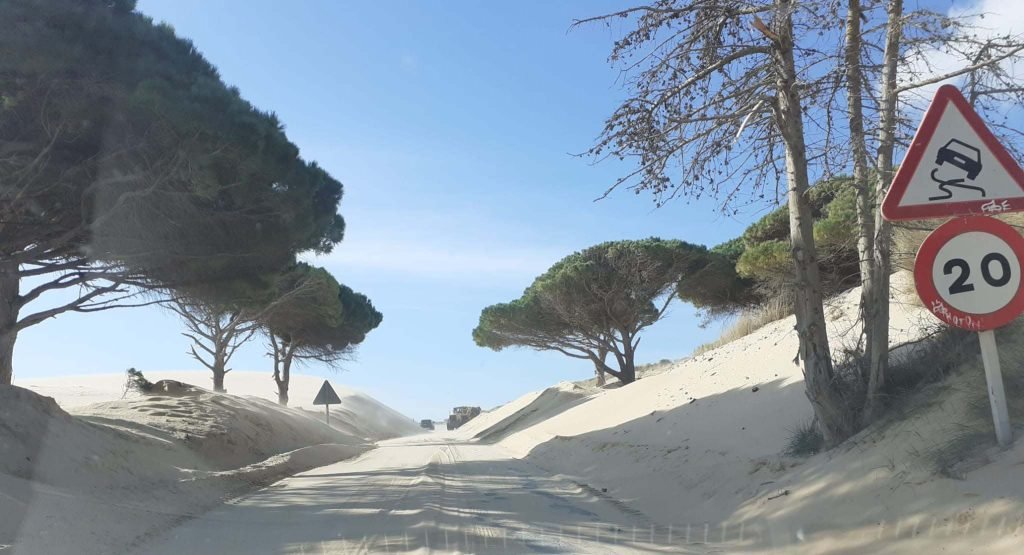 Pero también contamos con carreteras en las que la naturaleza nos recuerda continuamente quien manda y las hace desaparecer bajo el manto de arena de una duna, como la A-2325, en Cádiz.