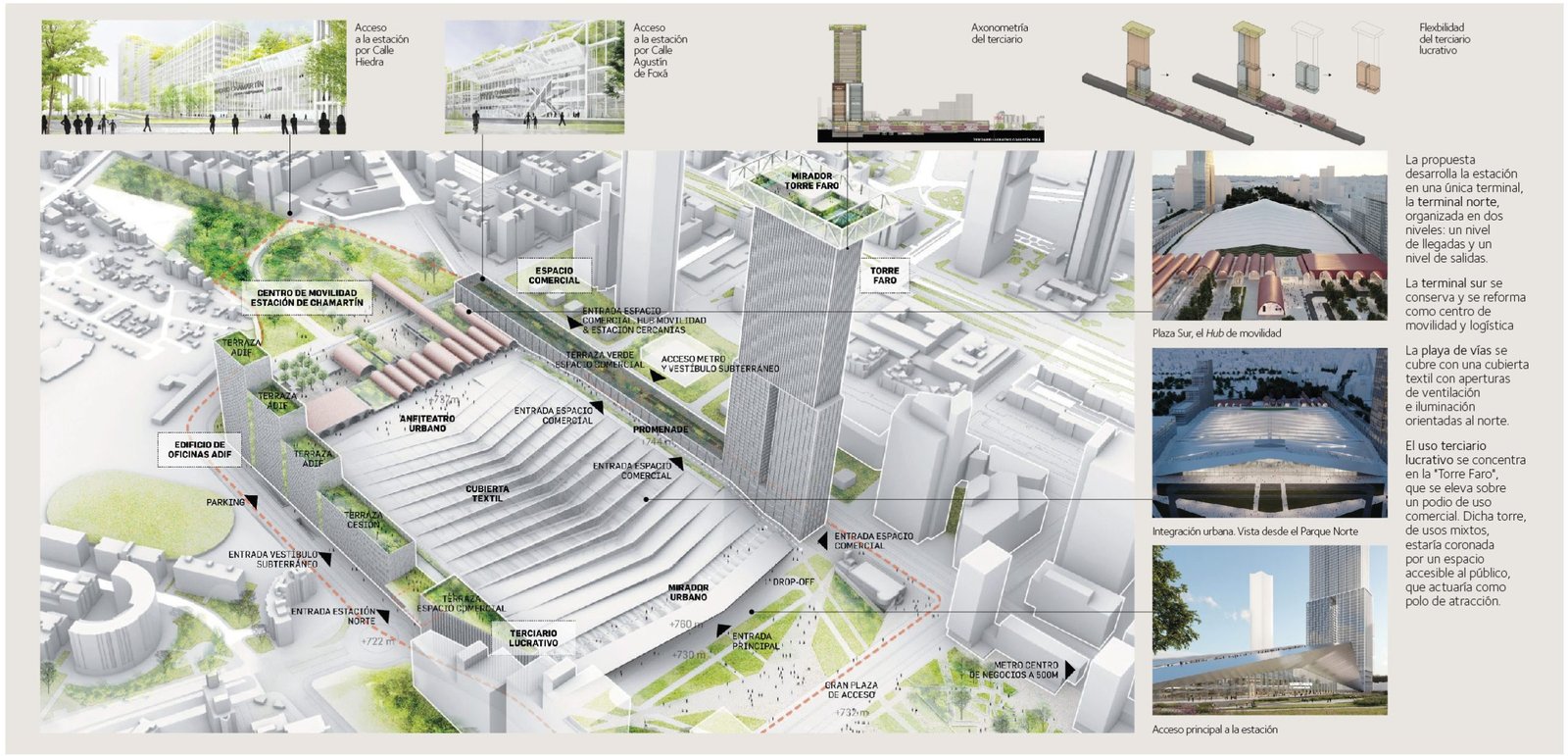 El sector del proyecto terciario se concibe como un sistema estructurado a lo largo de la estación con múltiples entradas y salidas que permite la conexión de los diferentes niveles urbanos, ya sea para los espacios de la estación de Metro como para la estación o los niveles de cubierta. El conjunto edificado se afirma dentro de la silueta de la ciudad con un edificio en altura de programa mixto. Oficinas y hoteles constituyen el cuerpo de la torre, que se completa con una zona en la cúspide accesible a los habitantes. En resumen, una torre para Madrid que permitirá el uso a todos los madrileños.