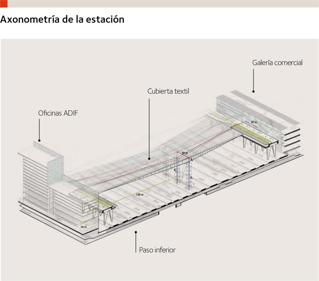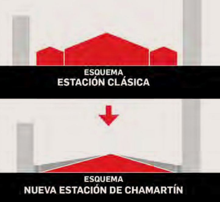 - La cubierta y la playa de vías generan un espacio único y referencial en el interior de la estación que se manifiesta en su extradós como un espacio urbano que configura, a su vez, la quinta fachada de la estación. • El vestíbulo norte y la plaza de la estación dialogan en su manifestación exterior, que es una abstracción de la estación clásica con la gran masa urbana y el desarrollo del centro de negocios.
