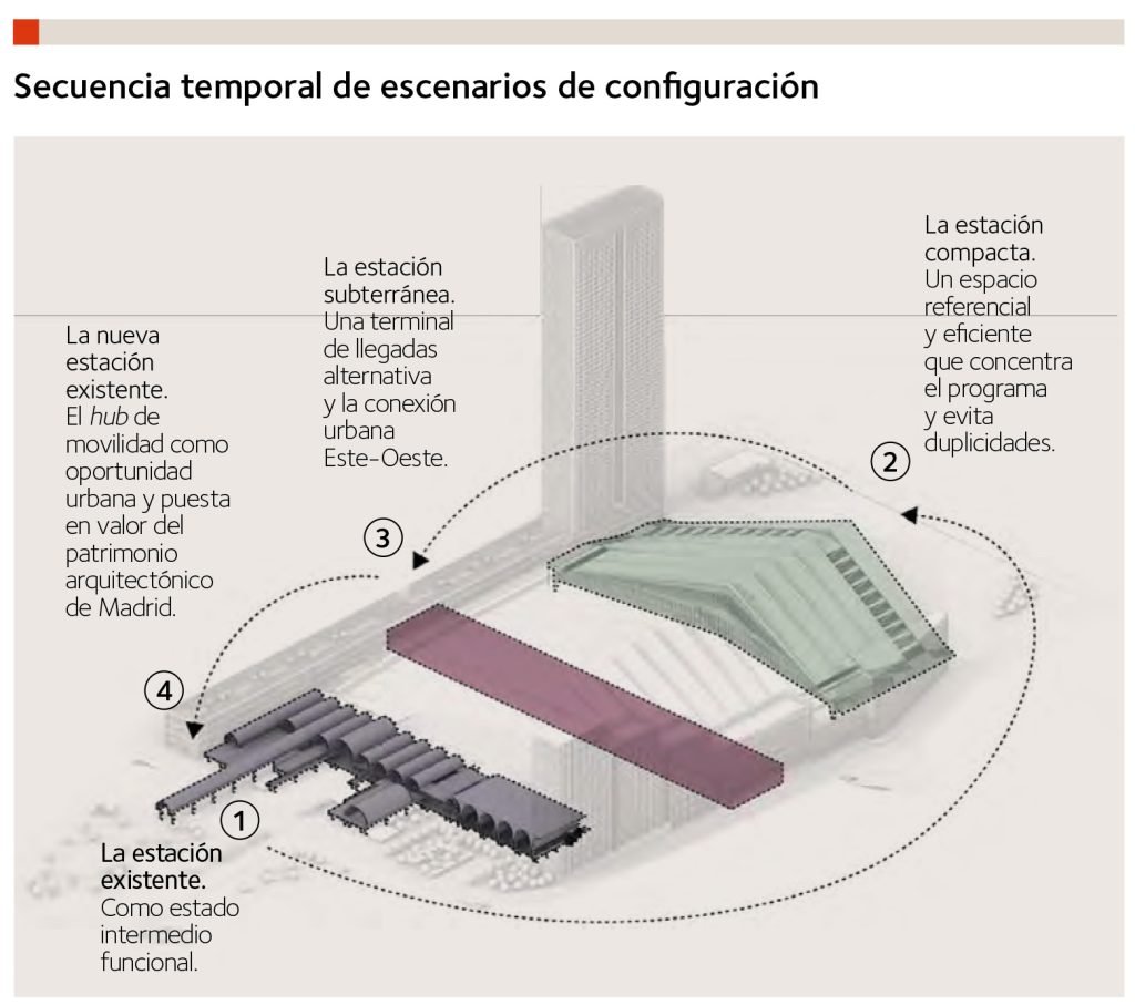 La complejidad de este concurso se expresa tanto en la solución específica del programa funcional como en la sucesión o coexistencia temporal de diferentes escenarios de configuración de las diferentes áreas funcionales de la estación, o más literariamente, de las estaciones (ferroviarias o temporales) dentro de la estación:
