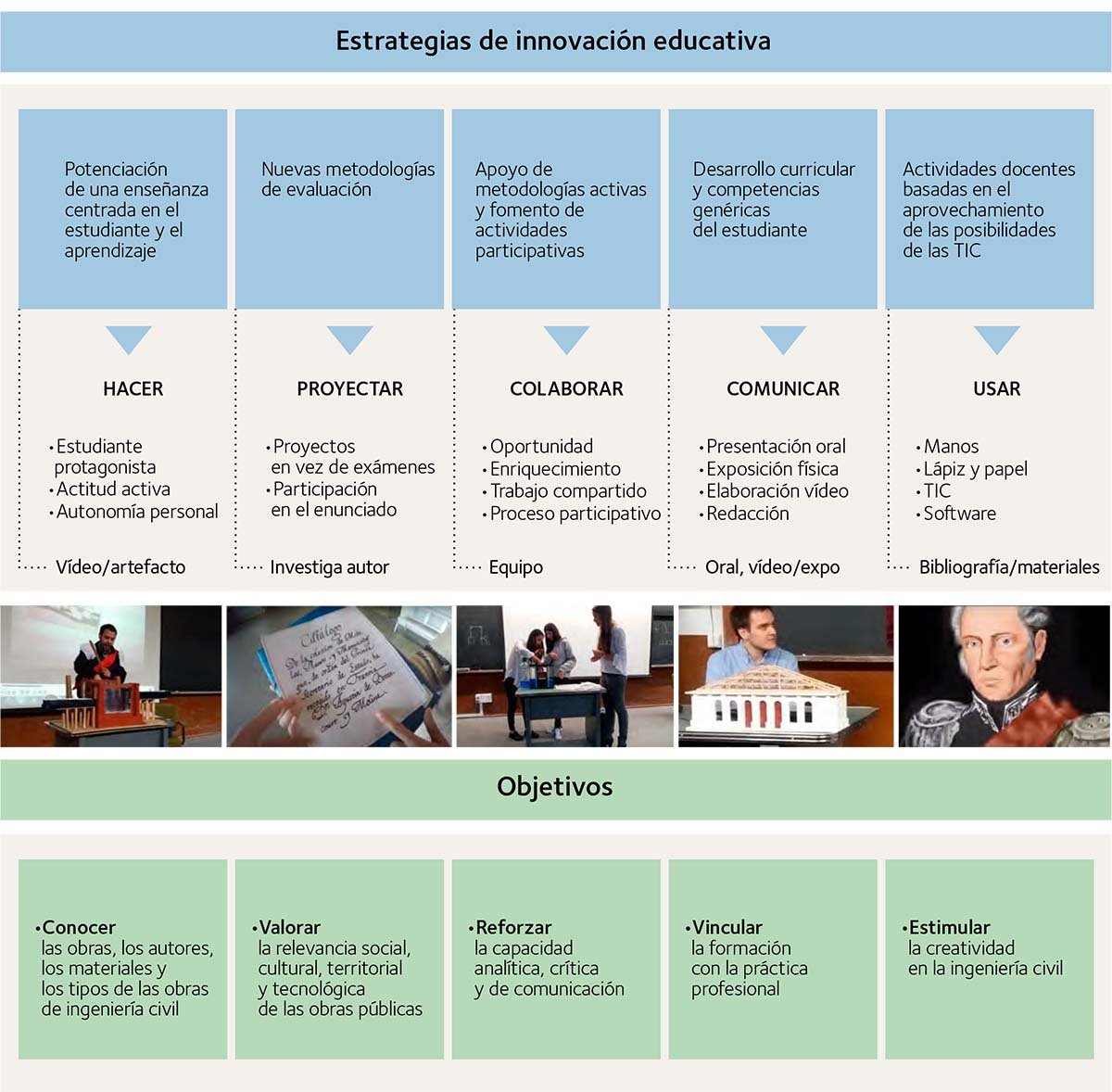 Tanto este proyecto como los otros realizados en la unidad docente de Historia, Arte y Estética de la Ingeniería Civil comparten las siguientes estrategias de innovación educativa: