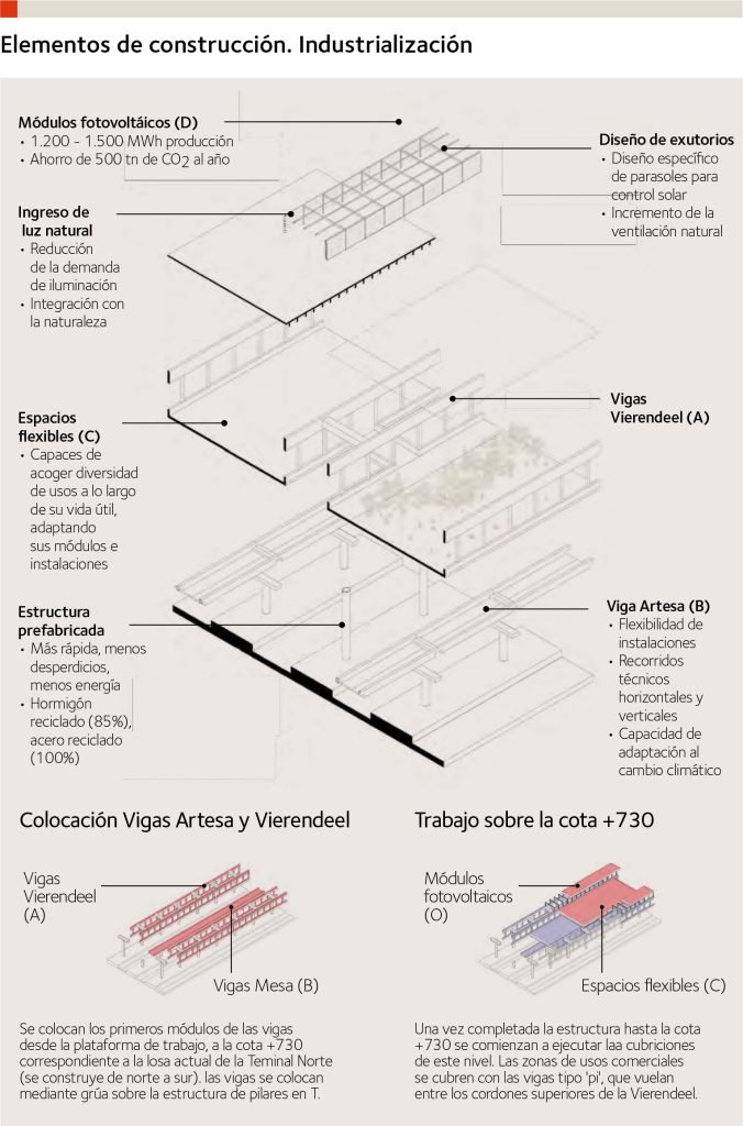 Es entre la unión de estos elementos estructurales, con grandes chimeneas de luz y ventilación, donde se ubican las líneas paralelas a la geometría de las vías en toda su longitud, garantizando riqueza espacial e iluminación natural en el interior, con elementos de hormigón prefabricado con montaje por fases.