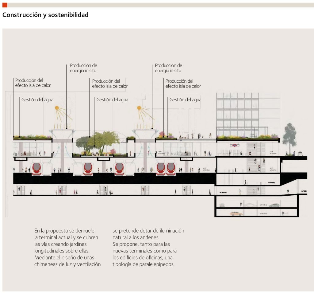 La estación se configura como confluencia intermodal con otros sistemas de transporte, completando el mapa del país: una estación de carácter nacional, en Madrid, con dos terminales como centro neurálgico del sistema ferroviario español unidas en el subsuelo. Esta idea resulta muy sugerente para la nueva estación porque ¿cuál es, para el ciudadano, el elemento más atractivo de Atocha desde la perspectiva del uso público? Los jardines interiores debajo de la estructura del XIX.