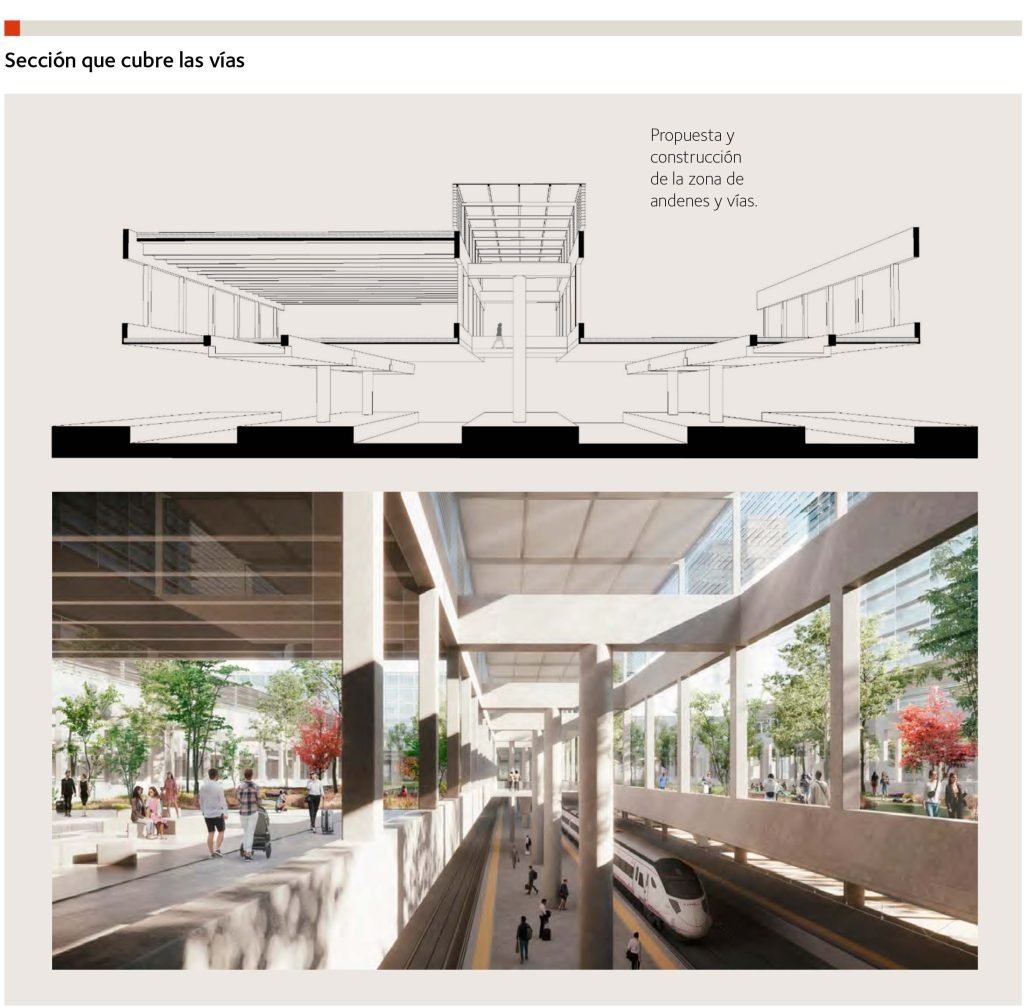 La sección permite vestíbulos de mayor altura que la actual, 10 metros, con iluminación cenital en toda su dimensión. Las estaciones adquieren así una dignidad y unos valores espaciales acordes con la importancia del nuevo edificio. Sin alardes arquitectónicos, aprovechando las posibilidades estructurales heredadas, tanto vestíbulos como estaciones tendrán el mismo carácter formal, sobrio y potente, de elementos prefabricados que las marquesinas que cubren las vías. Estos vestíbulos en doble altura permitirán que los usos por encima de la cota 737 tengan vistas hacia el propio vestíbulo y el acceso a las actividades se produzca desde dos espacios: los vestíbulos para los usuarios del tren y desde la cota 737, quedando las nuevas construcciones «a pie de jardín».