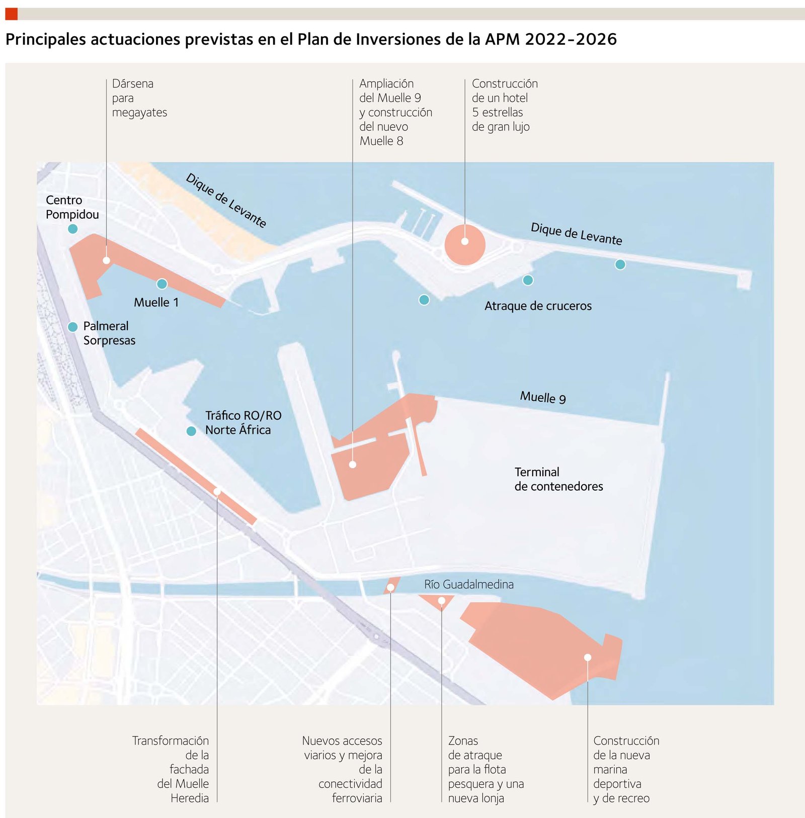 • La transformación de la fachada del Muelle Heredia a fin de crear nuevas instalaciones destinadas a fomentar la atracción de grandes sedes de empresas tecnológicas y de servicios interesadas en posicionarse en el centro de la ciudad, permitiendo además extender la peatonalización y la apuesta del Puerto por una movilidad sostenible mediante la construcción de una gran avenida que permitirá conectar el río Guadalmedina con el inicio del Palmeral de las Sorpresas en el Muelle Dos.
