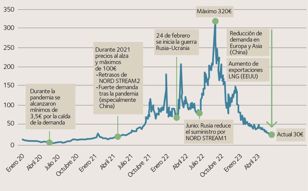 El gas de referencia en Europa (TTF) ha sufrido grandes variaciones, pasando de mínimos de 3,5 €/MWh térmicos a niveles por encima de los 300 €/MWh en apenas unos meses.