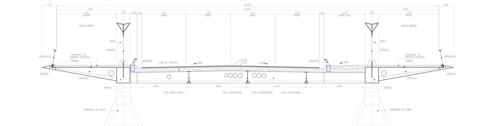 Bajo los arcos, en acero, dos nervios longitudinales de sección prismática integran el tablero, formando el cordón de tracción del arco y anclando las péndolas que cuelgan la plataforma. La zona central del tablero y la zona volada de la acera están formadas por dos costillares metálicos. Aguas abajo, la zona volada finaliza en un pronunciado saliente o “nariz”. Aguas arriba, son los propios elementos estructurales, sin elemento ornamental alguno, los que componen la forma.