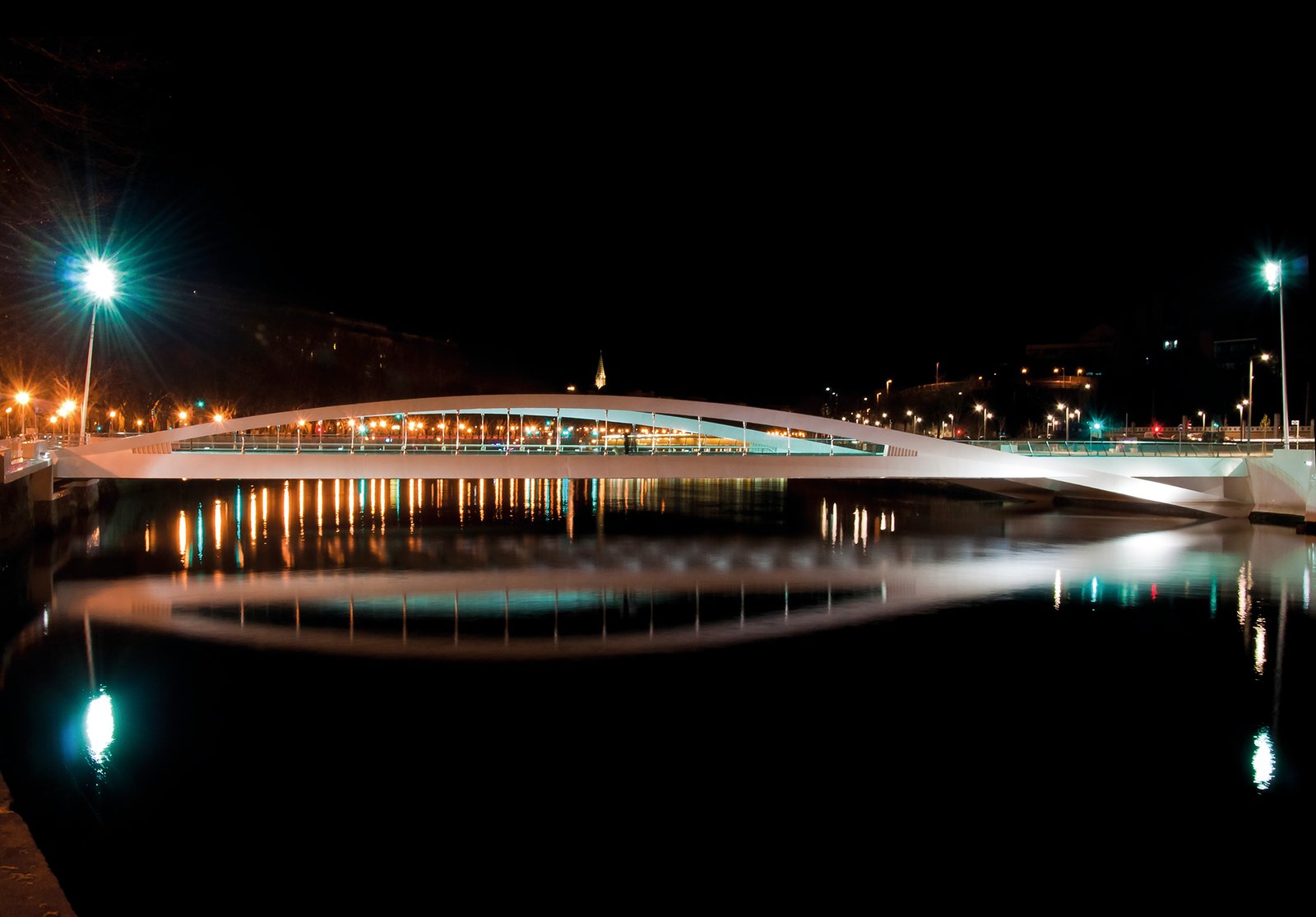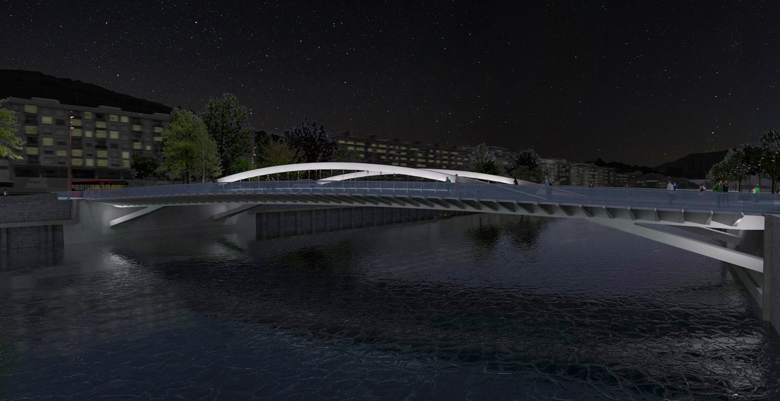 Dos arcos gemelos emergen desde la ribera derecha, se elevan sobre la rasante y apoyan en el paseo de la margen opuesta, conceptualizando un alzado sólo surcado por la horizontal de la plataforma. En planta, los dos arcos paralelos delimitan una zona interior formada por la acera de aguas arriba y la calzada, y permiten, de forma no simétrica, volar un balcón aguas abajo entre ambas riberas.