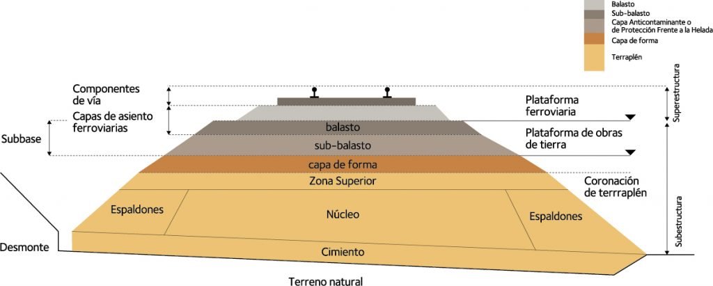 La sección transversal de un terraplén de una línea ferroviaria puede quedar dividida en las zonas que se observan en la figura de la página 90. Esta propuesta no resulta óbice para que, durante las diversas fases de diseño, los proyectos específicos puedan identificar a mayor detalle requisitos particulares que supongan la presencia de zonas adicionales dentro del terraplén.