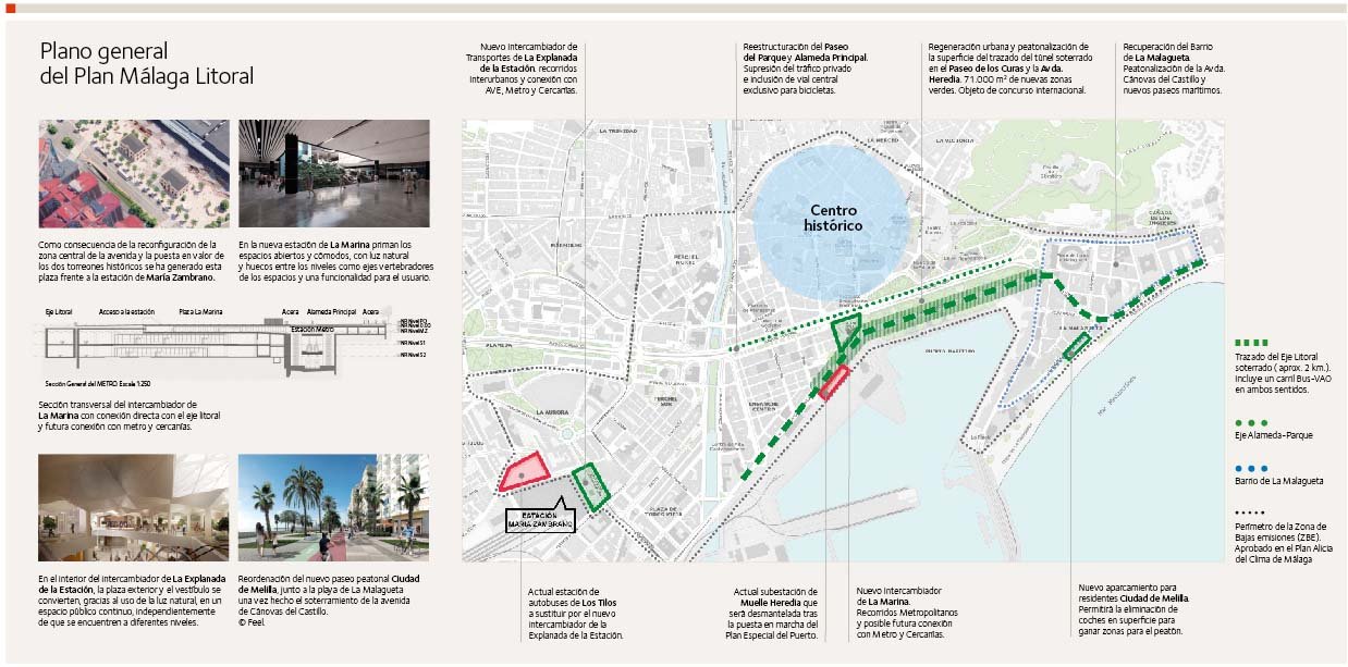 Un túnel de unos 2 kilómetros, desde el río Guadalmedina, por el oeste, hasta la calle Gutenberg, por el este, que elimina el tráfico rodado en superficie en el centro sin impedir la conexión este-oeste, fundamental para la ciudad, y dando prioridad al autobús mediante la instalación de un carril bus-VAO. Este eje también servirá para dar acceso directo a la estación de la Marina.