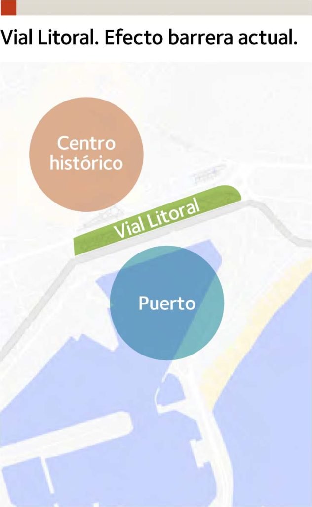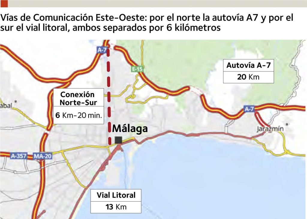 Otro de los aspectos que actualmente condiciona la movilidad en la ciudad es la importancia de la conexión este-oeste por el vial litoral, con un tráfico diario de 62 000 vehículos, que, debido a la orografía y a la estructura urbana de la ciudad, solo tiene una alternativa de conexión por la autovía A7, separada 6 km del centro urbano. Este vial litoral supone una barrera muy negativa y se produce la paradoja de que dos de los principales atractivos de la nueva Málaga, el Centro Histórico recuperado y los muelles 1 y 2, están separados entre sí por hasta diez carriles de circulación.