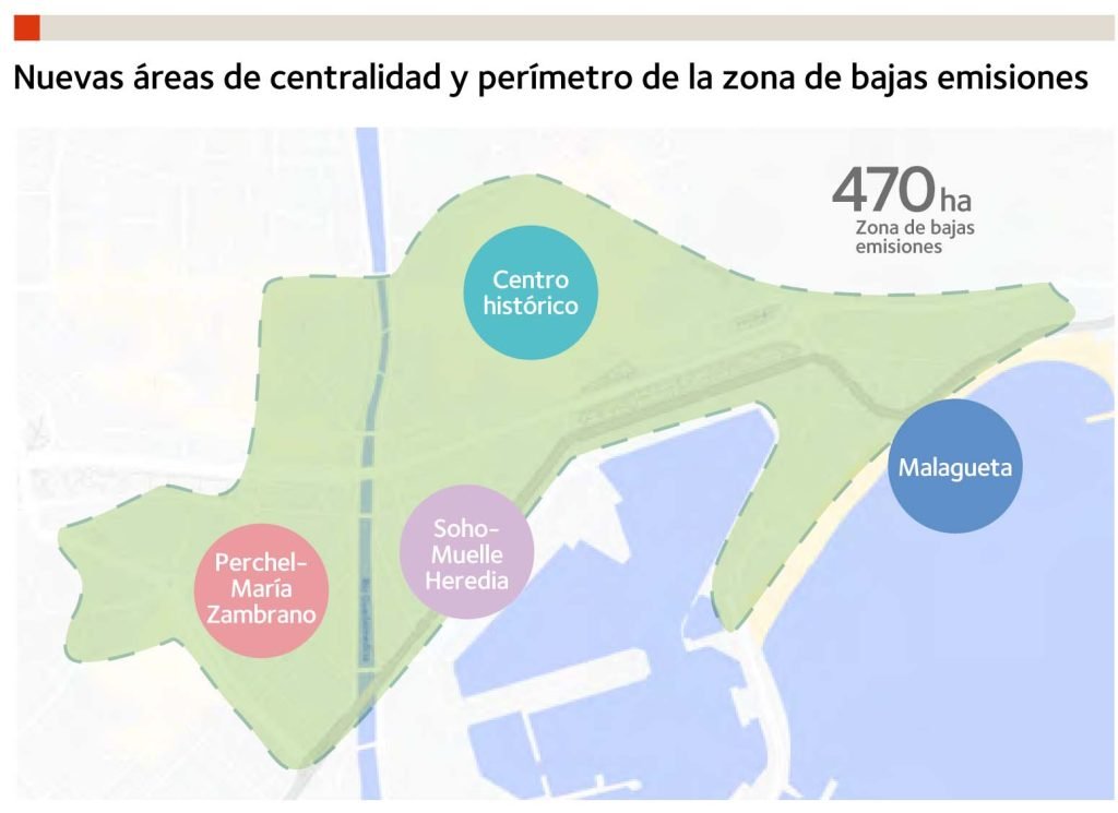 El PML propicia la creación de una nueva área central de la ciudad de Málaga al servicio de su territorio metropolitano, con nuevas áreas de centralidad que complementan la existente del Centro Histórico, en concreto, la Malagueta, el Soho y El Perchel-María Zambrano.