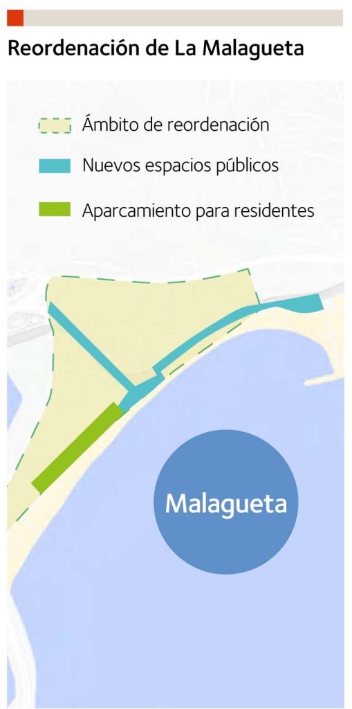 A partir del soterramiento de la avenida Cánovas del Castillo, se reordena el barrio de la Malagueta, integrando el este y el oeste e incrementando el espacio público peatonal. Un aparcamiento para residentes bajo el paseo Ciudad de Melilla permitirá eliminar coches de la superficie.