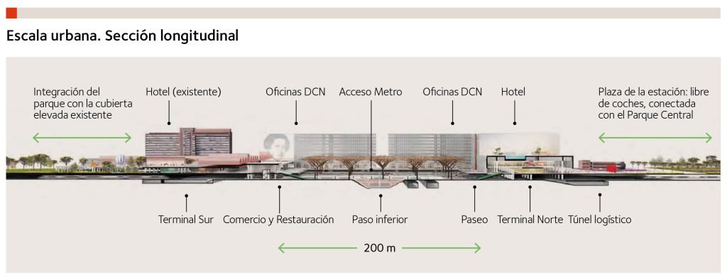 Si bien la cubrición de las vías no era objeto de la propuesta por ser unos trabajos que actualmente se encuentran en curso, sí se ha tenido en cuenta en lo relativo al diseño de las zonas externas incluidas en el ámbito del proyecto, tanto al norte como al sur de la estación, constituyendo los elementos de transición con los proyectos colindantes (Parque Central Madrid Nuevo Norte, etc.), que incluyen parte de las zonas a cubrir delimitadas por las líneas del Sistema General Ferroviario las cuales en el plano inferior (cota aproximada 723 metros) se mantendrán como zona ferroviaria y, en el plano urbano (cota aproximada 733 metros), serán zonas verdes, calles o parcelas dotacionales, a excepción de las parcelas ferroviarias de la estación de Chamartín y de salida de las vías de ancho UIC, AVE, de conexión con Atocha.