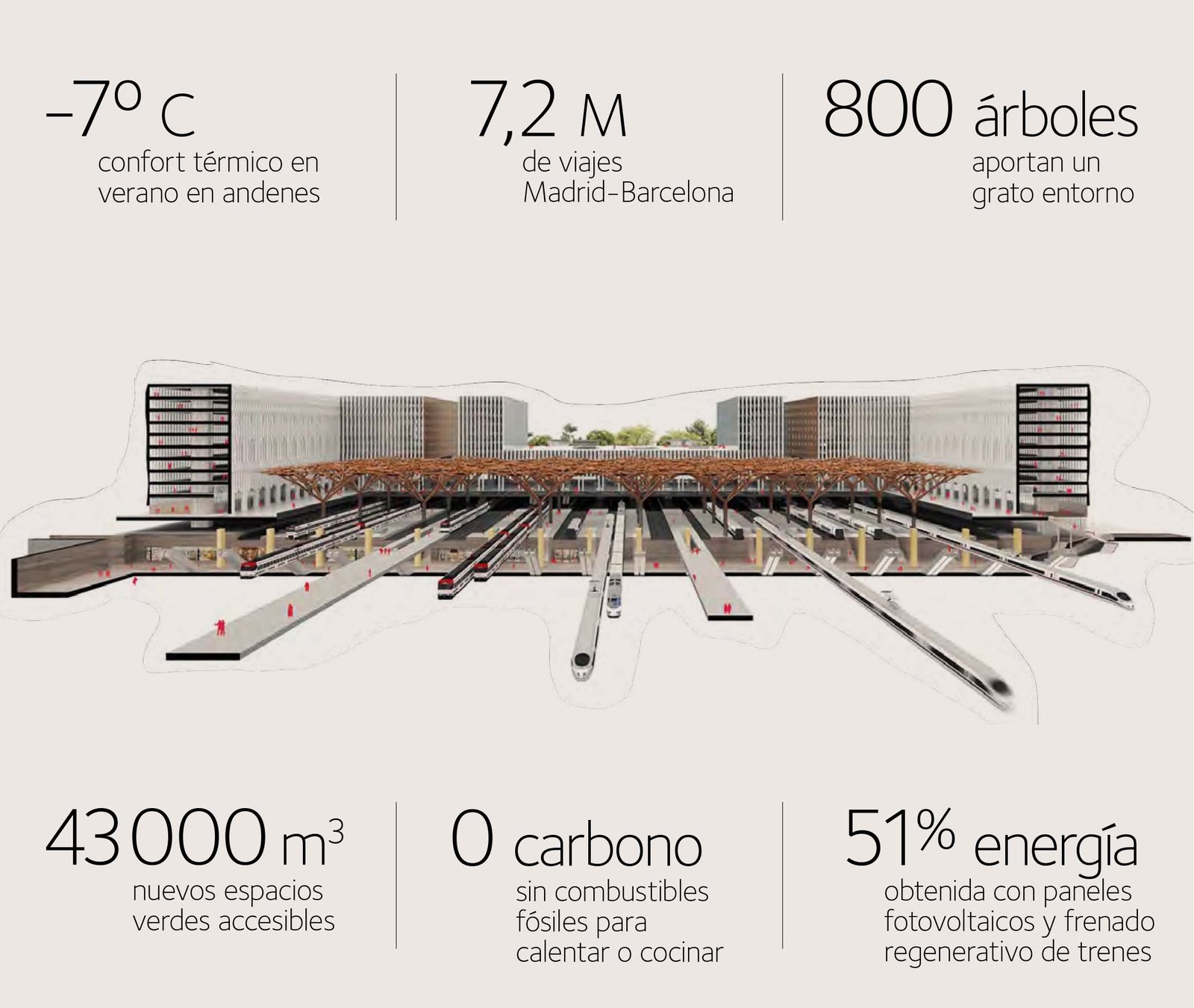 El proyecto despliega el espectro completo de fuentes de energía renovable. Una microrred inteligente proporciona un sistema de almacenamiento de batería virtual descentralizado para la carga de coches eléctricos. Pequeñas turbinas eólicas en las estrechas aberturas dentro y entre los edificios aprovecharán la energía del viento predominante norte-sur. Las células fotovoltaicas que cubren la totalidad de la superficie de las cubiertas capturarán la energía solar de los veranos, cada vez más calurosos, de Madrid. Se recuperará la energía liberada por el frenado de los trenes. Para cuando el nuevo complejo de la estación esté completamente construido, la aplicación de más tecnologías innovadoras podría permitir que la estación genere energía por encima de sus propias necesidades, estableciendo así un nuevo estándar de sostenibilidad: de «neutralidad de carbono» a «carbono negativo».