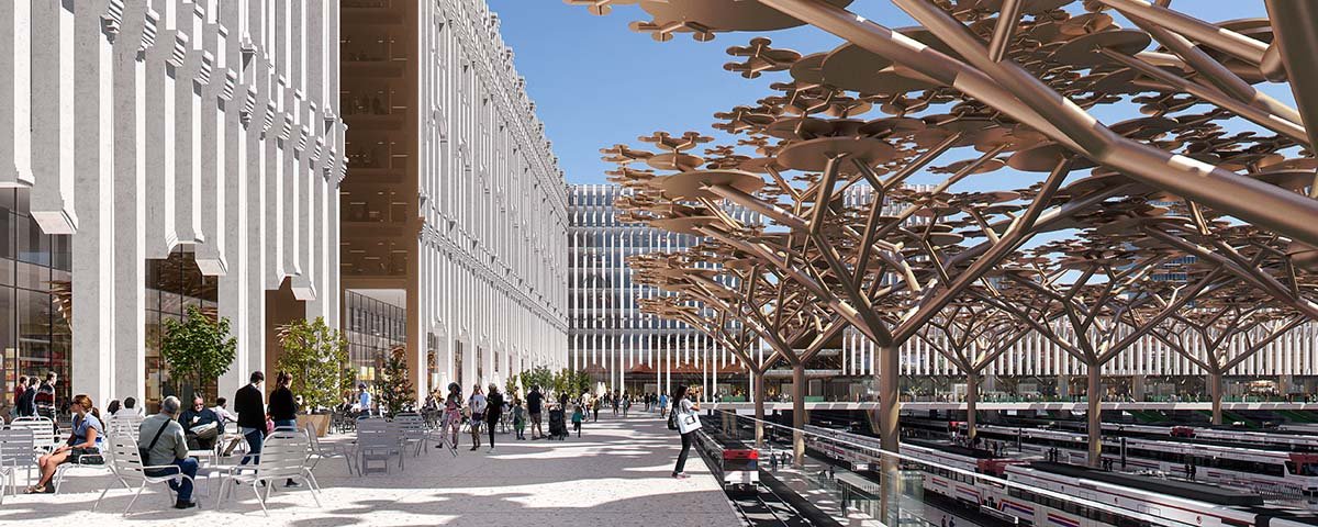 La nueva estación, en realidad, la Nueva Plaza, requiere un tratamiento especial. La propuesta hace posible visualizar los trenes desde las superficies de paso y estanciales que, como extensión de los bajos de los edificios de oficinas o de las terminales, balconeen sobre los andenes. A la vez, e insistiendo en su excepcionalidad, se plantea tratar el espacio interior del cuadrilátero como un bosque inesperado, concibiendo y tratando de forma arbórea las columnas de soporte de la cubierta y la superficie de cubrición como una densa suma de copas que arrojan sombra de día y luz de noche.
