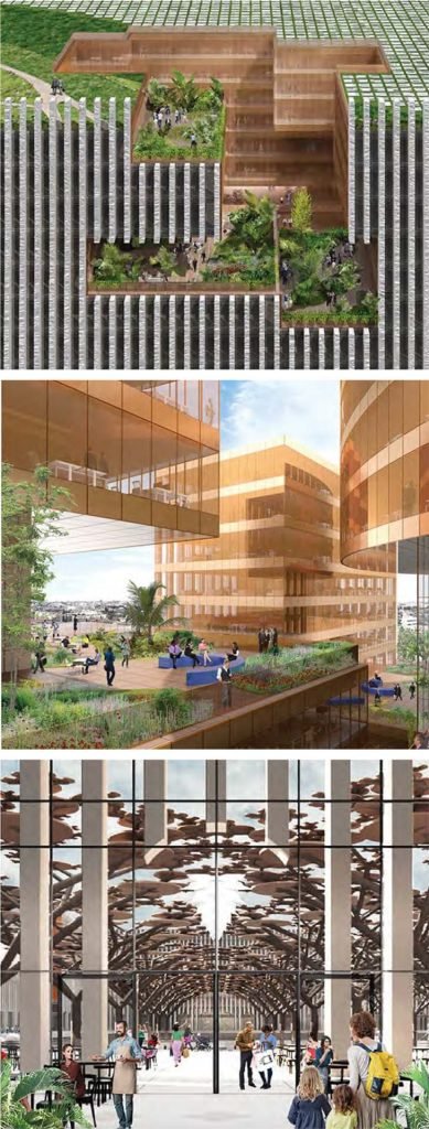 La composición de volúmenes de baja altura está diseñada de la forma más compacta posible para usar la menor cantidad de materiales de construcción. Se utilizan materiales reciclados locales donde sea posible. Todos los paneles de la fachada se fabrican con residuos de canteras locales, utilizados como áridos para los paneles moldeados. Las medidas de diseño pasivo reducirán significativamente la dependencia del acondicionamiento del aire, mientras que los sistemas de construcción inteligente garantizarán aún más el uso más eficiente de la energía.