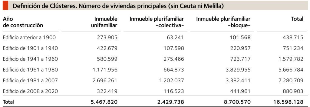 Escuchando a bienintencionados responsables de entidades financieras interesados en estar presentes en el potencial negocio que puede suponer la financiación de los miles de actuaciones que todos queremos que se realicen, pero que no acaban de cristalizar, nos asalta la duda de si conocen el funcionamiento real de las comunidades de propietarios (CCPP) y de manera específica las de los edificios de viviendas principales (de uso habitual), cuya rehabilitación es más necesaria y que serían los construidos entre los años 1940 y 1980, de tipo plurifamiliar, con 3 o más alturas, y que según la ERESEE 2020 incluirían 5.097.015 viviendas (véase tabla siguiente). De entre todos ellos, serían prioritarios para actuar los situados en la España continental con temperaturas más extremas en verano e invierno, que no dispusiesen de ascensor y se encontrasen en áreas urbanas o rurales con un grado medio-alto de vulnerabilidad socioeconómica.