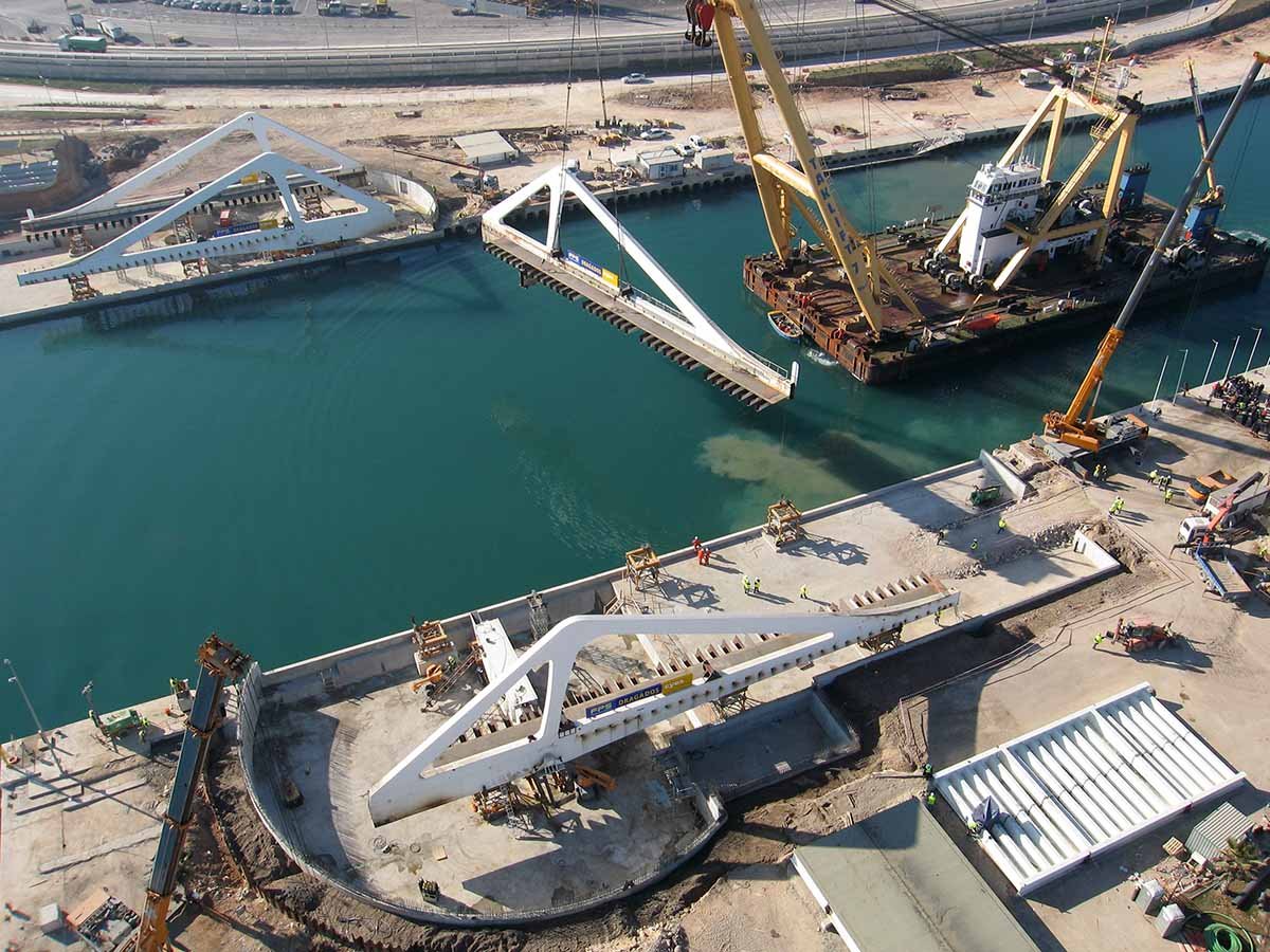El segundo ejemplo se refiere a su contribución en el ámbito de los puentes móviles. Julio sentía una especial predilección por retos que combinasen la ingeniería de estructuras con otras especialidades (astronomía-estructura en el citado GRANTECAN o arquitectura-estructura en edificación). En el caso de los puentes móviles, la mejor articulación e integración de los mecanismos de movimiento del puente con su estructura y subestructura suscitaba en Julio un particular interés.