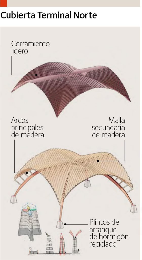 - Terminal sur: rehabilitación y ampliación de la cubierta y la losa existentes. Actuaciones interiores en madera para limitar el peso en la estructura actual;