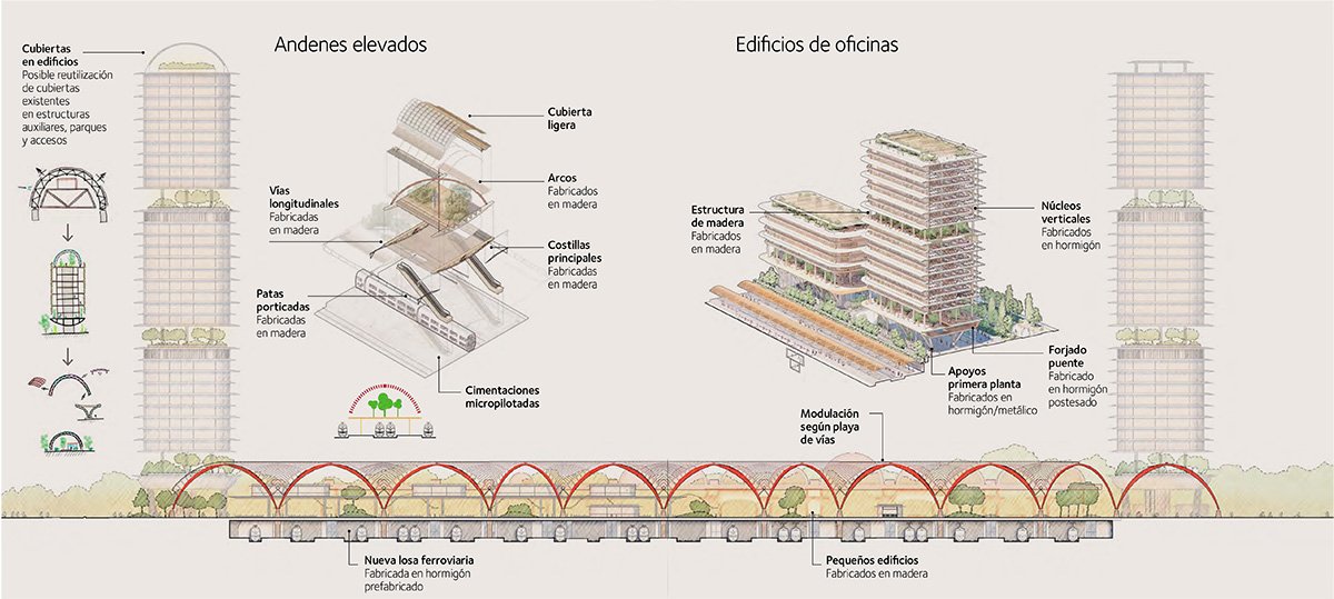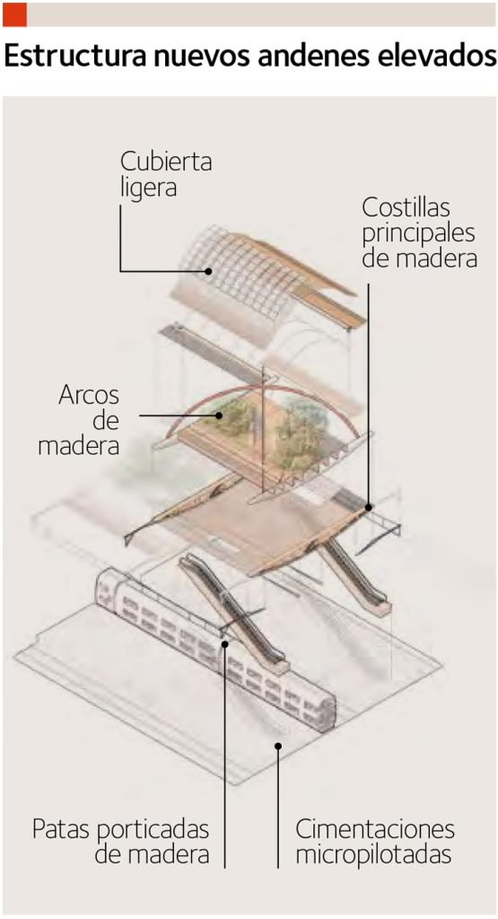 - Andenes elevados: cimentaciones micropilotadas en los andenes existentes. Estructura longitudinal aporticada de madera laminada + cuadernas transversales de madera, formando un entramado de madera a la cota +730. Forjados de madera y cubierta-umbráculo formada por arcos de madera + lamas + placas solares.
