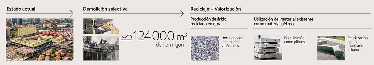 - Reutilizar: para los elementos que se demuelen, se maximizará su reutilización, ya sea para su uso en la estructura principal (vigas metálicas o cerchas reutilizadas), o para uso secundario (partes de pilares o losas de hormigón, como mobiliario urbano, o como dovelas estructurales de piedra artificial).