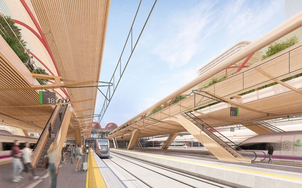 Arquitectónicamente, este espacio de andén elevado se materializa como una plataforma sobre vías que da servicio, al menos, a dos andenes. Se conciben como una superficie ajustada a la capacidad necesaria en cuanto a circulación, control e integración de flujos, evitando ejecutar una gran losa que cubra toda la playa de vías. Se crea la superficie necesaria para dar cabida a los usos previstos. Este espacio se define como lugar de paso y estancia y para él se propone una arquitectura que proporcione unas condiciones agradables con sombra, un jardín elevado bajo una estructura con cubrimiento que, en un espacio no acondicionado, tamiza la luz generando la sombra adecuada.