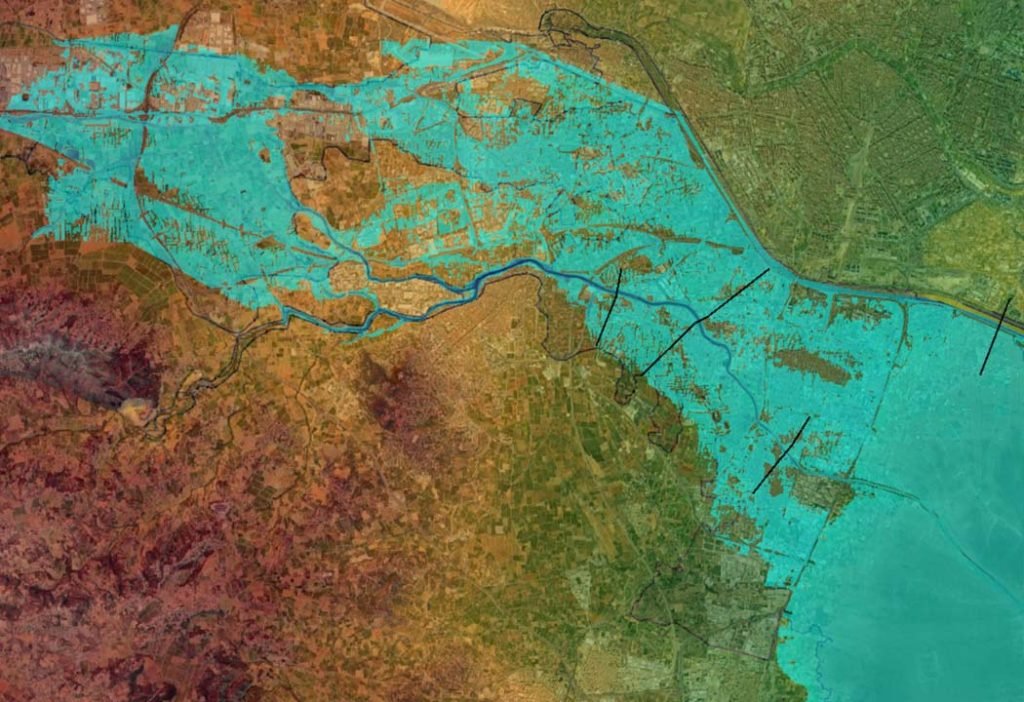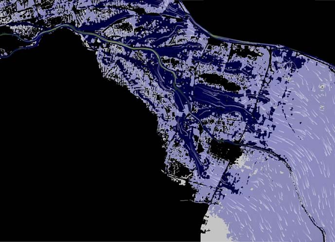 No obstante, el resultado más importante desde el punto de vista del objetivo del estudio es el de la potencia hidráulica de la corriente como indicador de la capacidad de arrastre de esta. Por tanto, y verificada la bondad del modelo, se obtuvo la capa con el valor de dicha variable (véase la primera imagen de abajo) en la zona de interés. Como se puede observar, aparecen tres grandes corrientes de flujo desbordado (hacia el este) con una importante capacidad de arrastre (tonos más rojizos): una por el norte —la más delgada al norte de todas representa el nuevo cauce del Turia y no entra en este análisis—; otra por el centro y otra por el sur. Estos grandes brazos de flujo son coherentes con la compleja morfología de cono aluvial de la zona. Establecido el umbral de potencia hidráulica, se obtiene el mapa binario (zonas con valores por debajo y por encima) que, una vez superpuesto al campo de velocidades y trayectorias del flujo, nos permite visualizar las zonas de interés (véase debajo la imagen central) como posibles parcelas de localización potencial de desaparecidos (aquellas que, habiendo recibido una corriente de potencia suficiente, se han disipado y tienen un valor por debajo del umbral). De esta forma, se identifican parcelas como las indicadas, debajo, en la imagen de la izquierda.