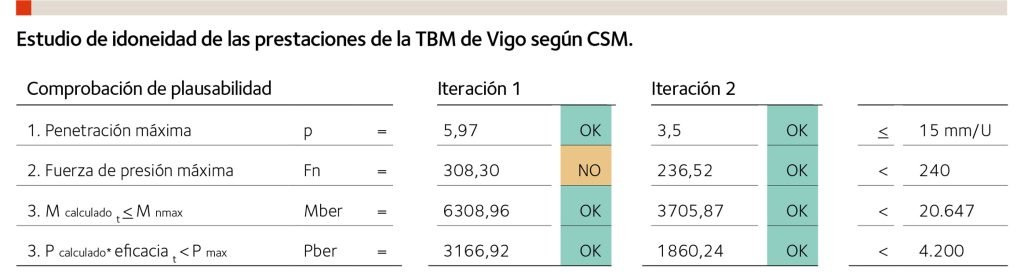 Las tuneladoras de Guadarrama fueron reutilizadas en Vigo. Sin embargo, el terreno excavado en Vigo ha sido significativamente más duro y abrasivo. Si se comprueban las prestaciones de la TBM para la penetración media obtenida a lo largo del proyecto (5,97 mm/rev), se observa que la fuerza de contacto de los cortadores es mayor que la capacidad de estos. La penetración a partir de la cual no se excede la capacidad de los cortadores es de 3,5 mm/rev (ver gráfica 6).