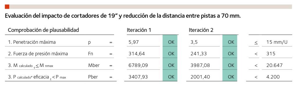 El uso de cortadores de 19” en vez de 17” tiene consecuencias claras en la mayor vida útil de los cortadores para terrenos muy resistentes y abrasivos al conllevar un incremento de la capacidad de estos. Esto redunda en la posibilidad de ejercer empujes mayores contra el frente. Ahora bien, estas modificaciones deben ir acompañadas de unas capacidades mecánicas mayores de la TBM.