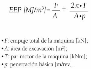 La EEP tiene dos componentes: la energía específica de empuje (primer sumando) y la energía específica de rotación (segundo sumando), y «las variaciones en dichas componentes están directamente relacionadas salvo casos muy particulares, con diferencias en la calidad geotécnica de los terrenos atravesados» (Tardáguila&, 2007).