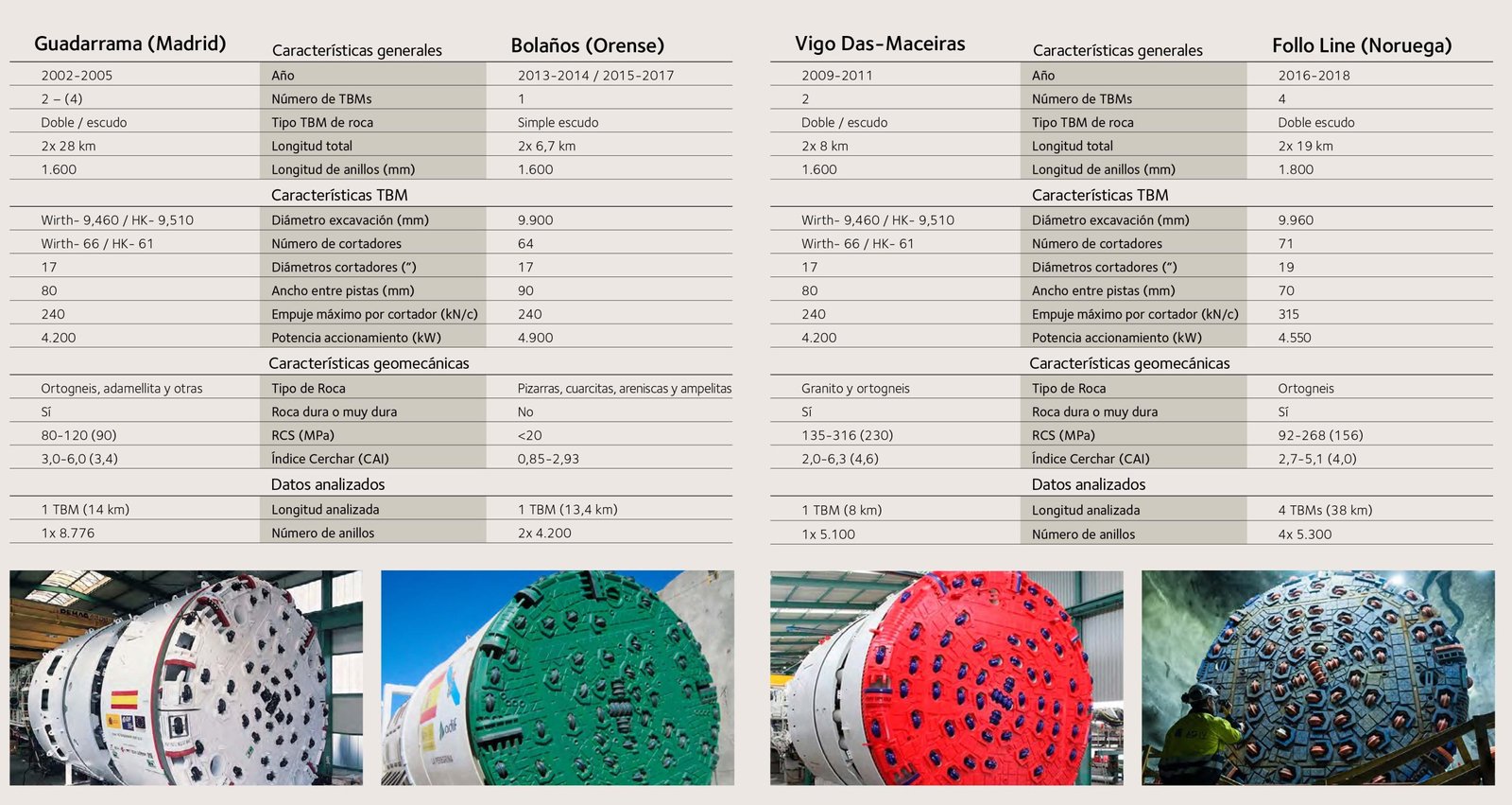 ACCIONA ha participado en algunos de los túneles mecanizados excavados en macizos de roca dura más icónicos de España y Europa. Entre ellos, destacan los proyectos ferroviarios de Guadarrama, Vigo das Maceiras y la Follo Line. Los datos fundamentales de dichos proyectos están recogidos en la siguiente tabla.