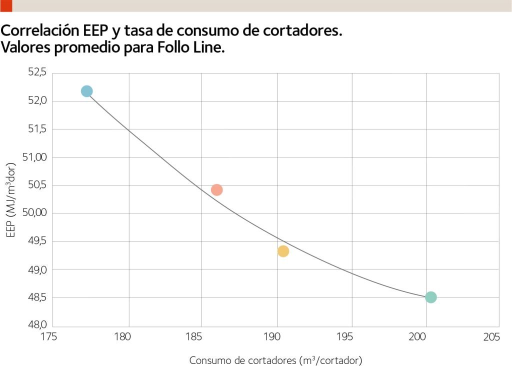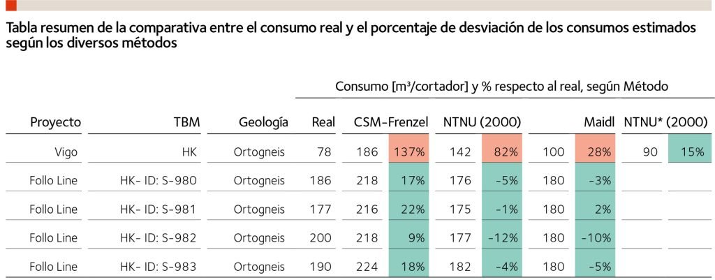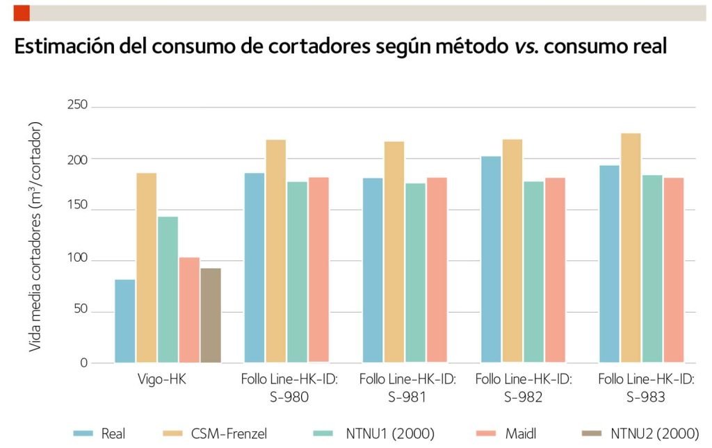 Por lo tanto, se puede concluir que el comportamiento diferenciado entre el desgaste en Vigo con respecto a Follo Line se observa tanto en las líneas de tendencia obtenidas en la correlación EEP y vida útil de los cortadores como analizando exclusivamente el consumo de cortadores real y comparándolo con otros métodos aceptados por la industria.