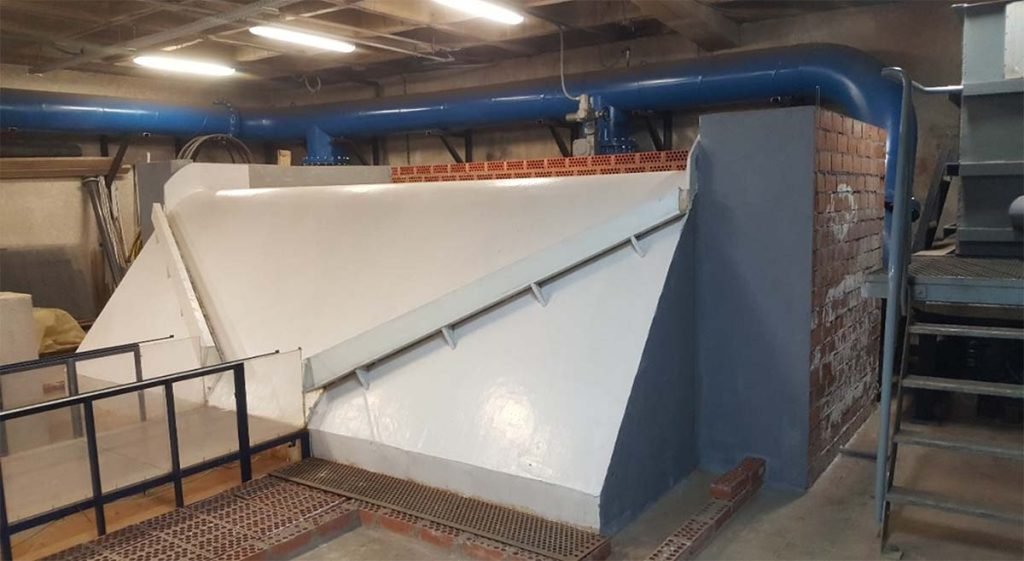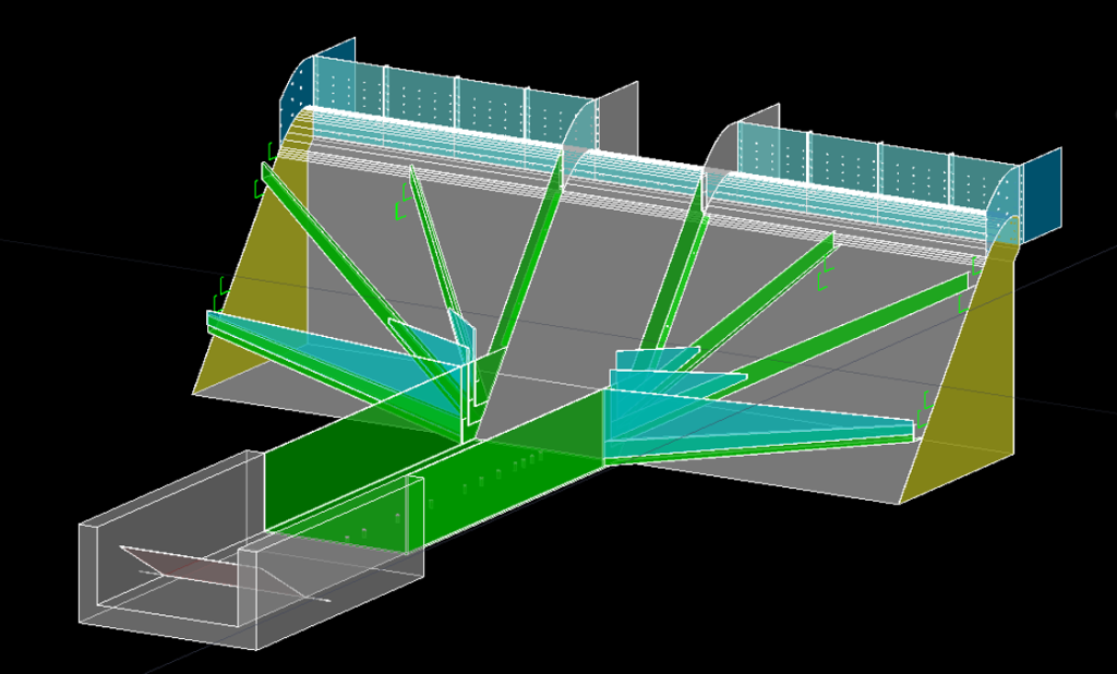 Finalmente se han incluido dientes oblicuos enfrentados al flujo de salida de los canales laterales, que disipan este flujo en primera línea. Todo ello favoreciendo la estabilidad de la formación del resalto y consiguiendo que la longitud del cuenco sea la óptima.